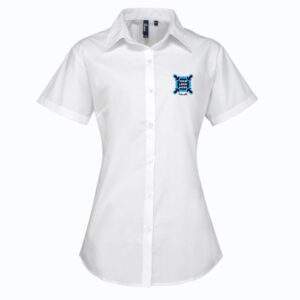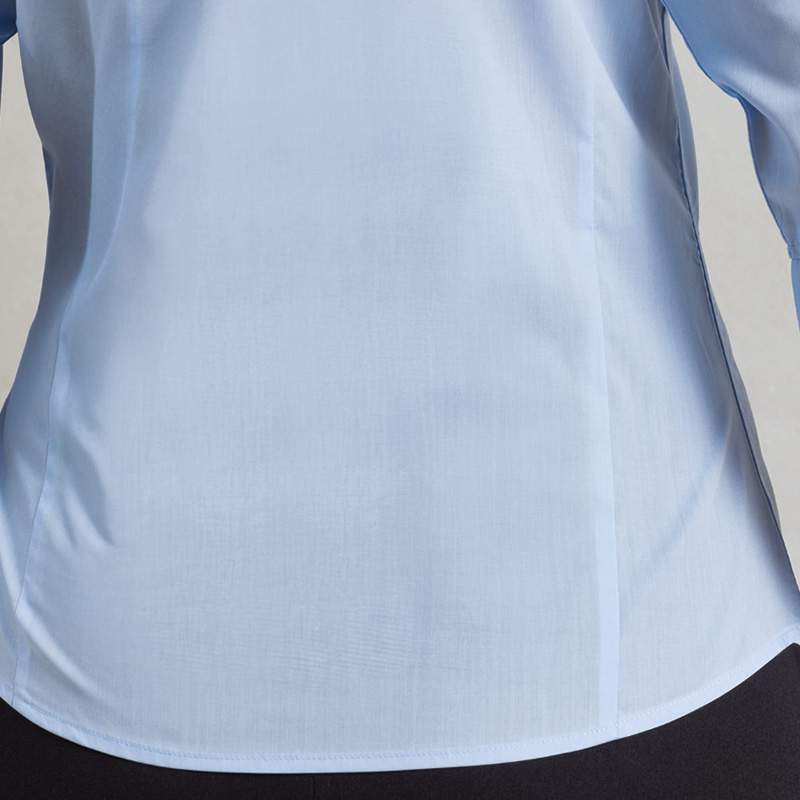 Soft collar styling, rounded bottom hem. Fitted styling with bust darts and back darts. Easy-care fabric. Pearlised buttons on light blue and white. Self coloured buttons on remaining colours.